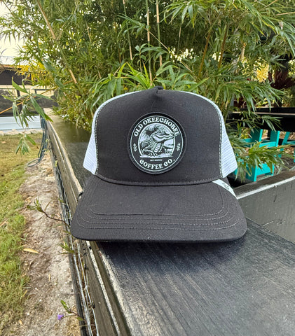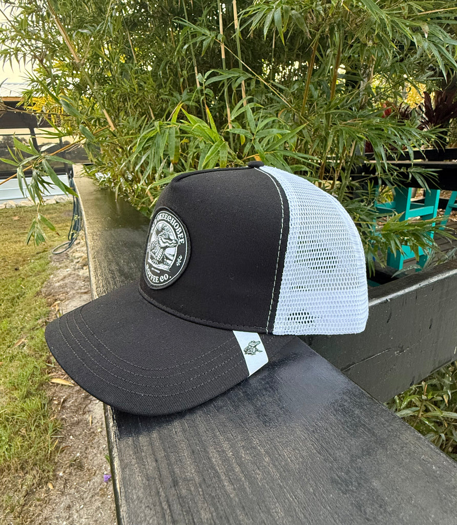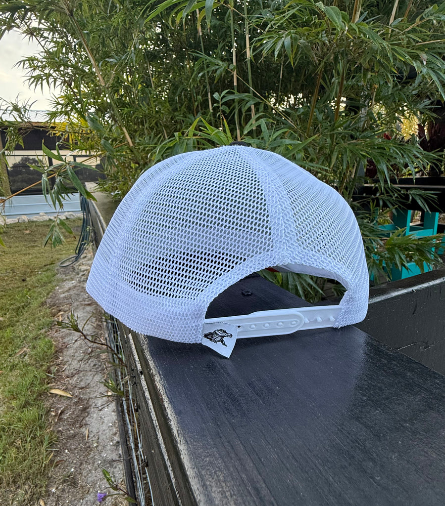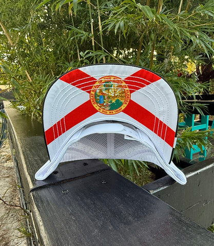 FREE SHIPPINGONE SIZE FITS MOSTSTRUCTURED TRUCKER MESH CAPSNAP BACK CLOSURE WITH BRAND TAGWHITE TRUCKER MESH, BLACK VISORFLORIDA FLAG UNDERNEATH VISORWOVEN PATCHNATURAL CURVED VISOR